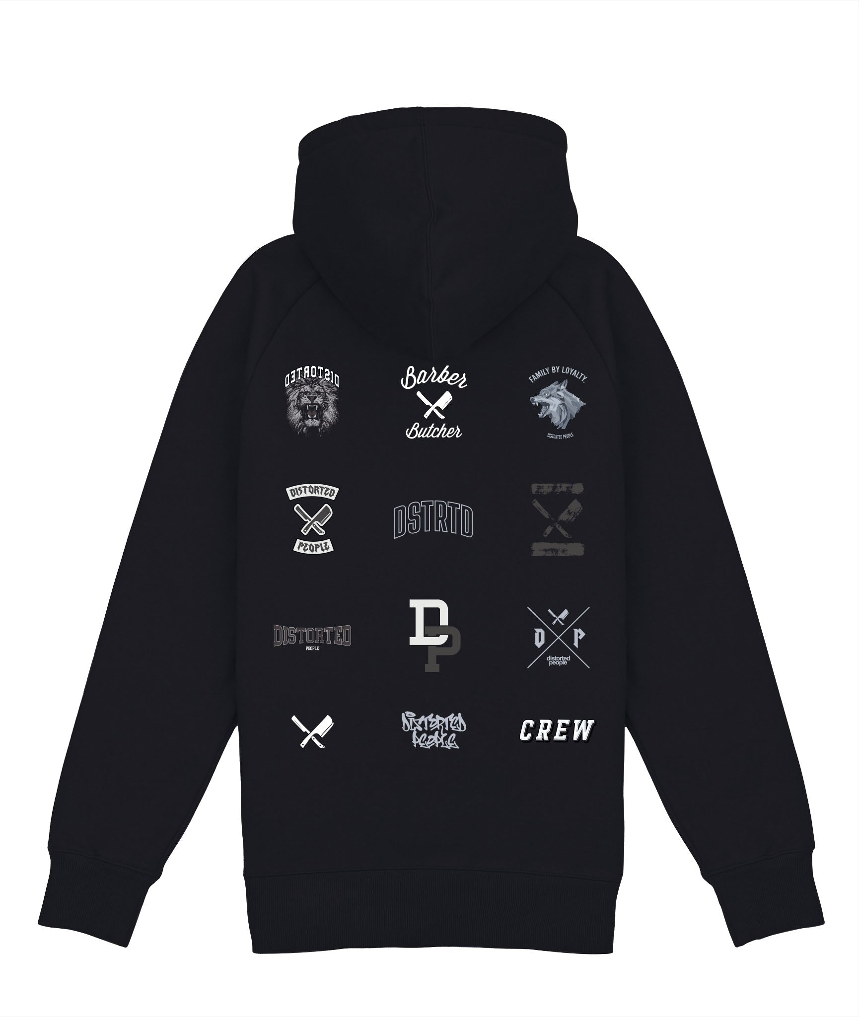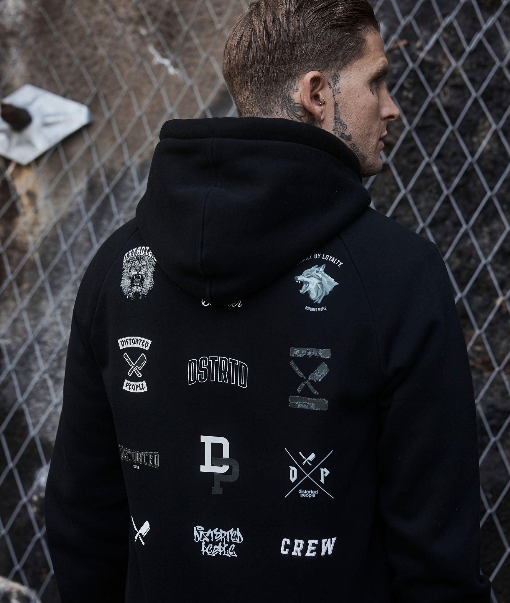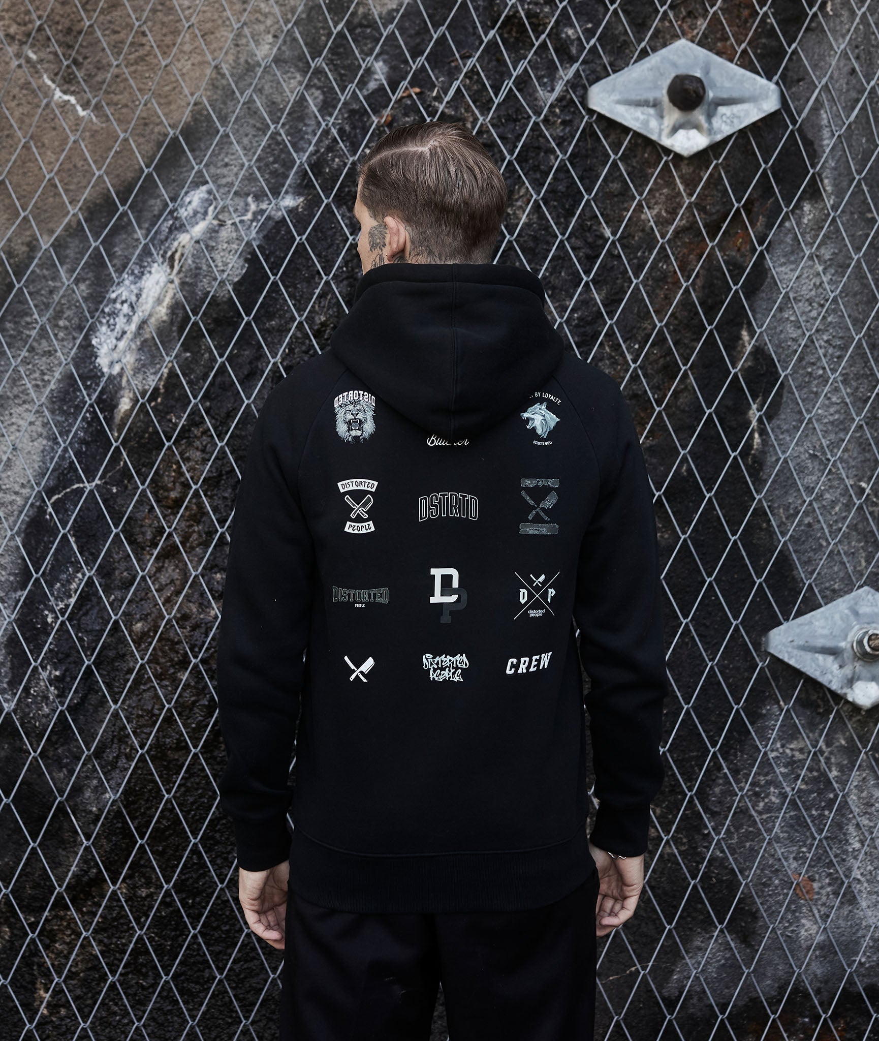 - Großer Backprint mit verschiedenen distorted people Logos aus der Vergangenheit